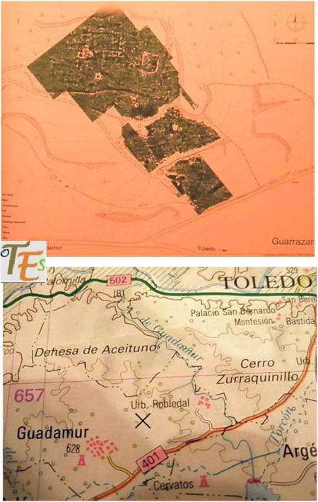 También se encuentran allí los planos de las excavaciones en Guarrazar por medio del Instituto Alemán, al que yo adhiero otro mapa mayor, marcando con una “X” , refiriéndome exactamente adonde se encuentra dicho lugar, en el que se encontró parte del tesoro de los reyes visigodos y otras dignidades.
